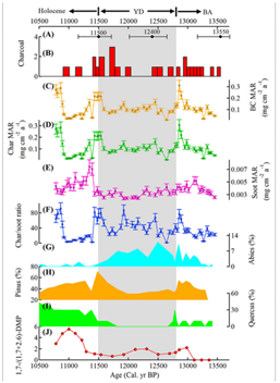 During the warm Bølling-Allerød (BA) interstadial (a warmer time period) about 15,000 to 13,000 years ago, the climate was temperate and mesic, as evidenced by the appearance of pollen of temperate deciduous oak (Quercus spp.) and pollen and macrofossils of the moisture-loving balsam fir (Abies balsamea). The char MARs during this time showed a slow increase and peaked at the end of the interstadial when temperate oak species became more abundant and boreal spruce (Picea spp.) declined. The colder, wet Younger Dryas (YD) period that followed was also characterized by high char MARs, but with some occasional troughs, and the char MARs showed a peak at the end of the YD when boreal trees, including larch (Larix laricinaPicea, and Abies balsamea abruptly disappeared.