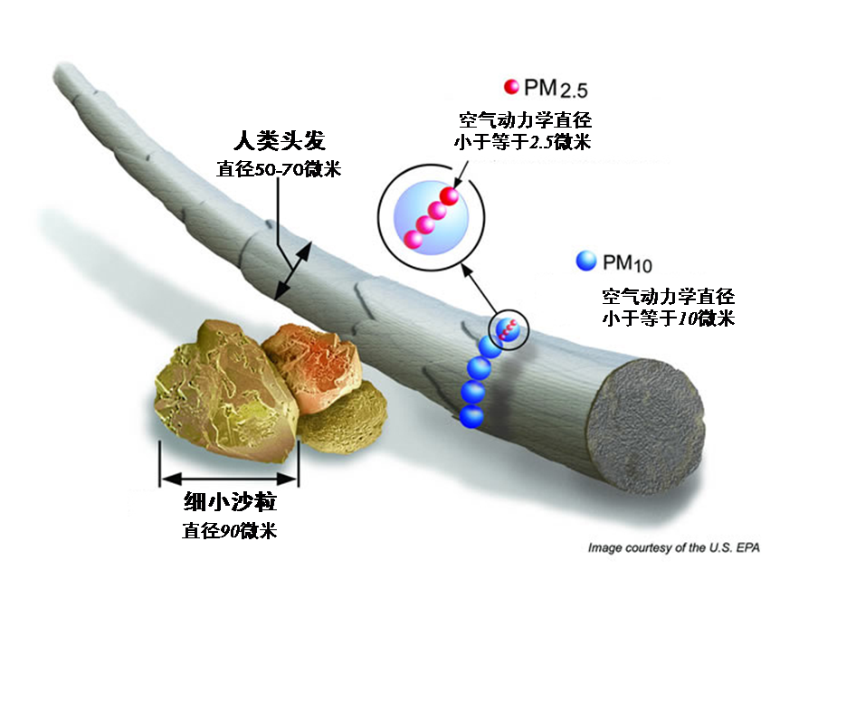 近年来,随着我国灰霾事件的频发,PM2.5这一原本晦涩难懂的专业术语开始步入民间,成为街头巷尾的热议话题。但是对于初次接触到这一名词的民众来说,“PM2.5”以及与其相关的一系列术语——“PM10”,“TSP”等也许会让人们觉得有些云里雾里,不知所云。事实上,全国科学技术名词审定委员会已经在2013年2月给了“PM2.5”一个容易理解的中文名字——“细颗粒物”,其中“PM”是英文Particulate Matter(颗粒物)的首字母缩写,而“2.5”强调的则是颗粒物中悬浮在大气中空气动力学等效直径小于等于2.5微米的那部分。PM2.5 粒子尺度极其细小,大概不到人类头发直径的二十分之一(图1),因而能够在大气中滞留长达数天之久,甚至输送到较远的距离,进而在区域乃至全球尺度上影响大气能见度、人体健康及气候变化。