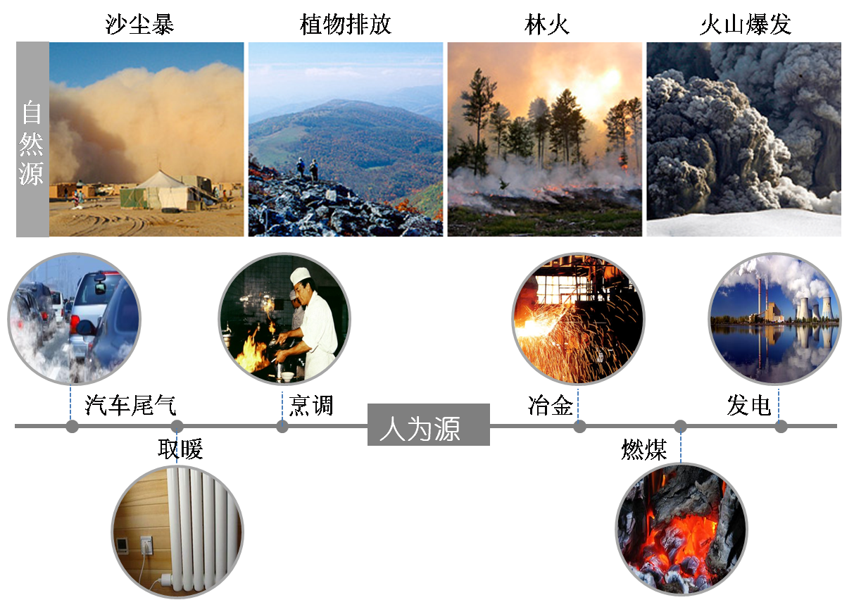 PM2.5的来源很复杂,主要分为自然源和人为源两种。自然源主要是由火山爆发、海浪泡沫、沙尘暴、地面扬尘、生物质燃烧(如森林大火)和植物排放等自然源产生;人为源则主要是工业及人类生活中排放产生的,包括化石燃料燃烧、家庭柴薪燃烧、工厂排放、道路扬尘、建筑扬尘和机动车尾气排放等(图4)。