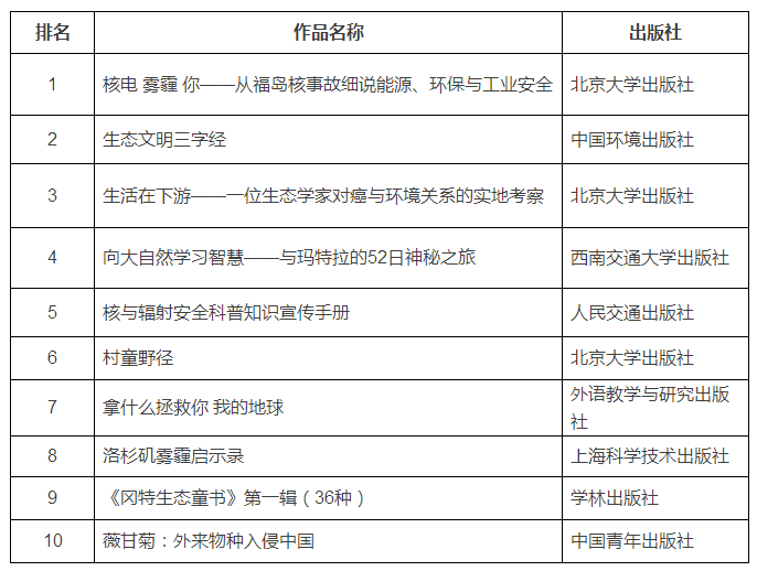 日前,由中国环境科学学会主办的第五届“环保科普创新奖”专家评审会和人民出版社读书会办公室承办的“科普图书网络投票”活动都划上了句号。经过14天的紧张投票,最终有10254名网友对入围的25本图书进行了投票,得票数前十名的图书如下所示: