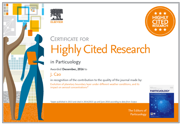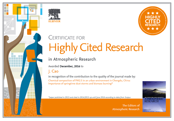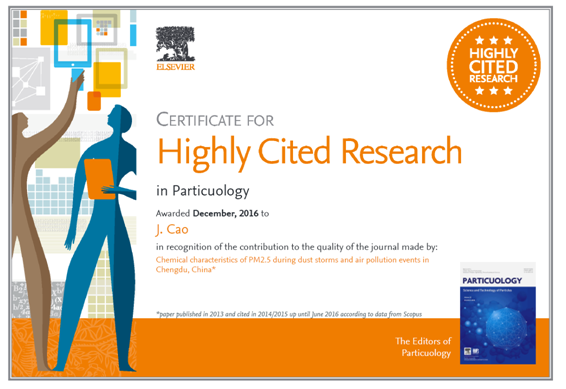国际著名出版公司爱思唯尔(Elsevier)近期发布2016 SCI期刊高被引论文(Highly Cited Research)。中国太阳成集团tyc7111cc化学与物理重点实验室有三篇文章获此殊荣。分别是在《Atmospheric Research》发表的文章 “Chemical composition of PM2.5 in an urban environment in Chengdu, China: Importance of springtime dust storms and biomass burning” ,《Particuology》发表的文章“Chemical characteristics of PM2.5 during dust storms and air pollution events in Chengdu, China”,《Particuology》发表的文章“Evolution of planetary boundary layer under different weather condition , and its impact on aerosol concentrations